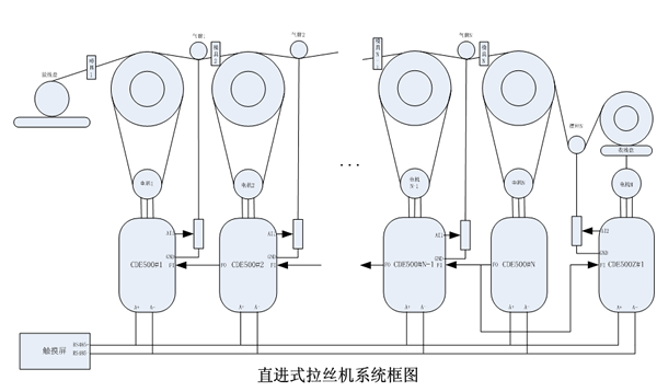 手工完成穿模后就可以整机运行实现连续的拉伸了。直进式拉丝机通常是由多台电机控制,经过多个拉伸模具后一次性把原材料拉到所需线径大小的成品。在这个工艺环节里,要求电机响应速度快,线材张力恒定,张力平衡杆波动小,不断丝不松丝。